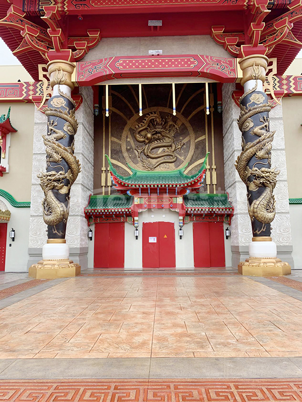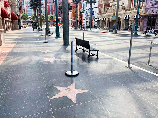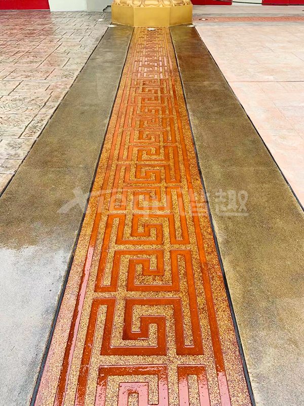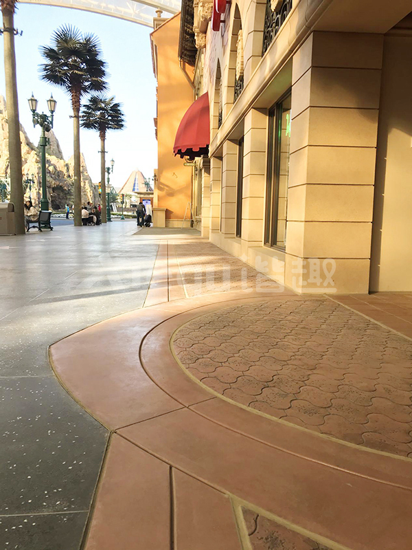 我司參與了北京環(huán)球影城好萊塢大道和小黃人兩個(gè)主題的路面鋪裝工作,鋪裝面積為2.4萬(wàn)㎡。其中包含了彩色混凝土礫石面藝術(shù)地坪、彩色混凝土壓印藝術(shù)地坪、彩色混凝土洗砂面藝術(shù)地坪、彩色混凝土鹽巖面藝術(shù)地坪、彩色混凝土仿泥仿塵藝術(shù)地坪、整體現(xiàn)澆路牙、掃毛面、座椅墻、化學(xué)著色等鋪裝硬景。