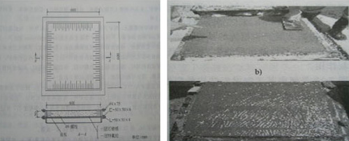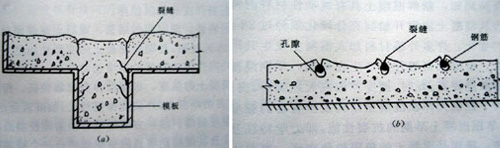 如圖-13示,某工地梁板結構的裂縫情況,當時天干風大,澆筑后未及時覆蓋,混凝土表面迅速失水開裂,當時混凝土并未初凝,但用壓抹的方法已無法使裂縫閉合,操作人員采用木榔頭敲砸的方法企圖使裂縫閉合,出現了圖示三種情況。由此可以看出,早期塑性裂縫在發現及時、處理得當的情況下,是可以避免的。